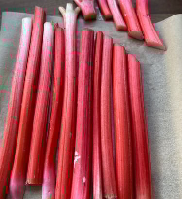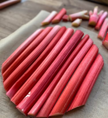 5. With a sharp knife, cut the ends of the rhubarb off so that you have pieces that fit the circle. Remember to angle the cut as you go round.
