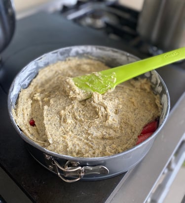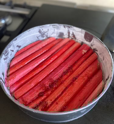 15. If some of the cake mixture has seeped through the rhubarb, don’t worry, gently scrape it away.