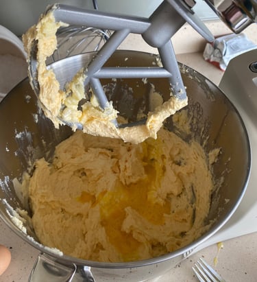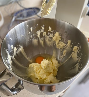 9. Take an egg, break it into a little bowl, lightly beat it, add it to the butter and sugar mixture, beat it in.