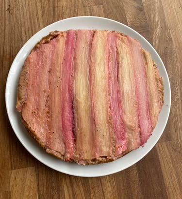 6. When all is cut, put the paper circle in the bottom of the cake tin and reassemble your sticks of rhubarb. You might have to trim them a bit more to fit.