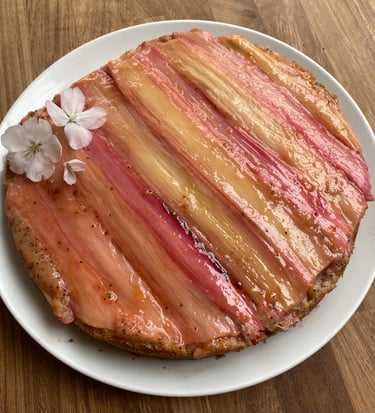 A note on rhubarb: from January to end March you will be able to source the neon pink forced rhubarb. Some of that is still around in April, but it’s giving way to garden rhubarb, thicker stalks, more of a deep red and green colour, which looks duller when cooked, but is so flavourful. If you can’t find bright pink forced rhubarb, don’t despair, just focus on the flavour. The pictures given here are from a cake made in March, and that’s why the rhubarb is so pink. You don’t have to use rye flour. I love its earthy nutty flavour. It’s different, nutritious, and as we are now encouraged to eat a greater variety of plant foods, this is another one to add to your repertoire. You can substitute this for wheat flour if you prefer. If you make this switch, omit the baking power.