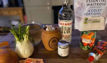 Add the onion, garlic, fennel, saffron, the alcohol, tomato purée, and cook over a low to medium heat for 10 mins. Stir occasionally. It is not to brown, you just want all the flavours to meld.